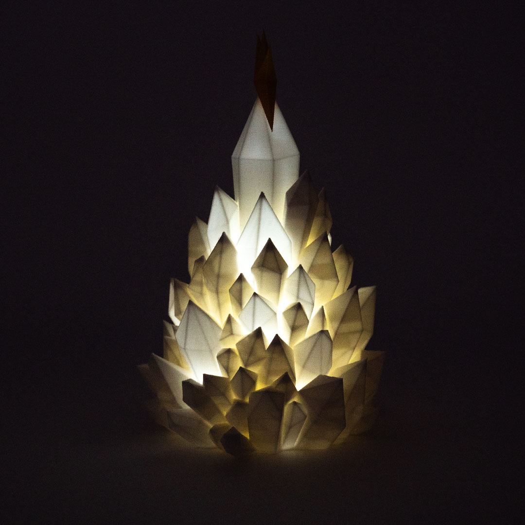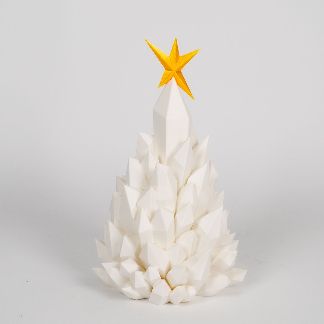 Nowoczesna dekoracja inspirowana formą kryształów i geometrycznych świątecznych kompozycji. „Krystaliczne Świąteczne Drzewko” pięknie prezentuje się w ciągu dnia jako minimalistyczna rzeźba, a po zmroku – dzięki umieszczonej we wnętrzu elektrycznej świeczce – zmienia się w pulsujące, świetliste drzewko o wyjątkowej strukturze.