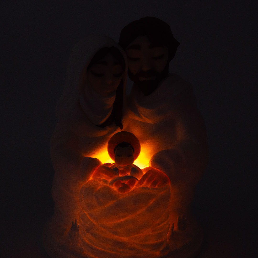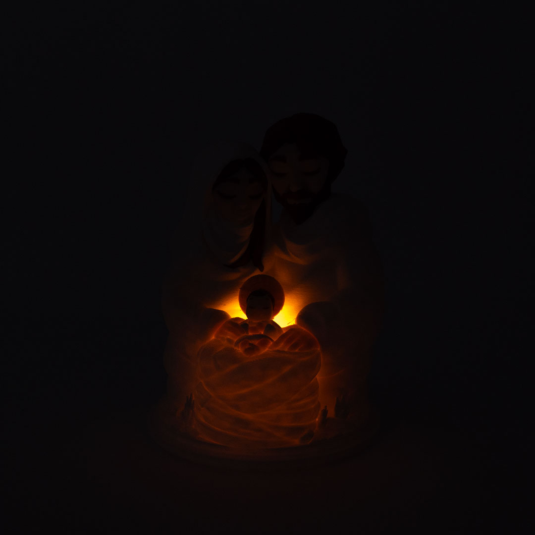 Światło subtelnie rozświetla postać Dzieciątka i tworzy aurę spokoju, rodzinnego ciepła oraz magicznej symboliki.